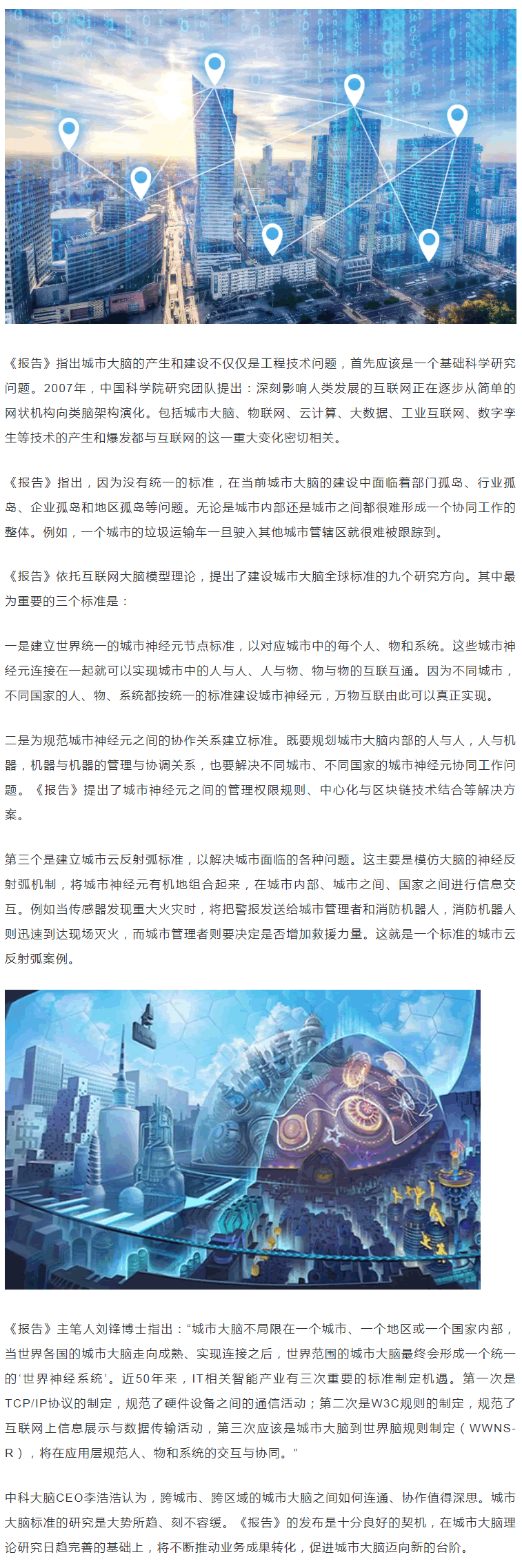 12月23日,城市大腦標(biāo)準(zhǔn)研究組、中國科學(xué)院虛擬經(jīng)濟(jì)與數(shù)據(jù)科學(xué)研究中心等單位聯(lián)合發(fā)布了世界首份《城市大腦標(biāo)準(zhǔn)研究報(bào)告》(以下簡稱《報(bào)告》)。《報(bào)告》詳細(xì)闡述了城市大腦的起源、發(fā)展、現(xiàn)狀和趨勢,并發(fā)布了相關(guān)理論基礎(chǔ)和構(gòu)建城市大腦標(biāo)準(zhǔn)的九個(gè)研究方向等一系列重要研究成果。