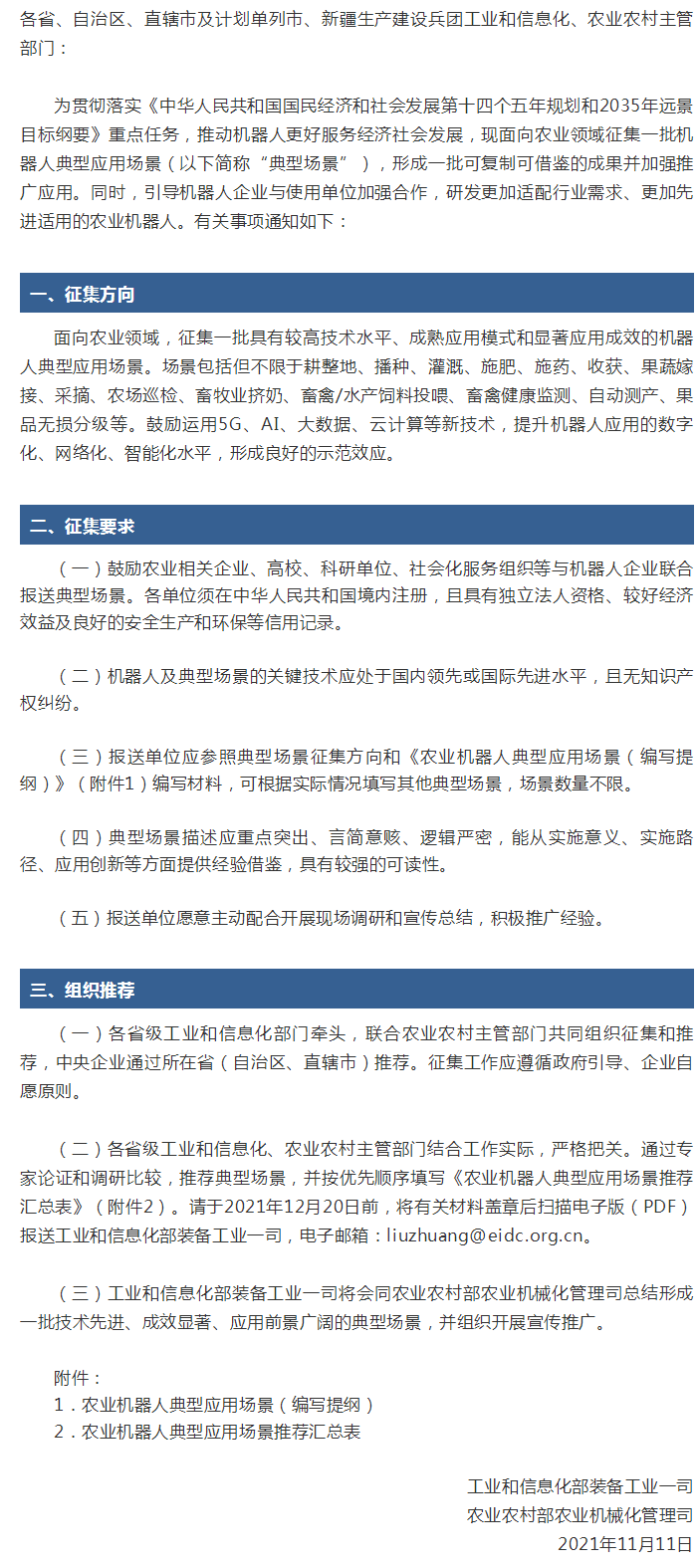 面向農(nóng)業(yè)L域,征集一批具有較G技術(shù)水平、成熟應(yīng)用模式和顯著應(yīng)用成效的機(jī)器人典型應(yīng)用場(chǎng)景。場(chǎng)景包括但不限于耕整地、播種、灌溉、施肥、施藥、收獲、果蔬嫁接、采摘、農(nóng)場(chǎng)巡檢、畜牧業(yè)擠奶、畜禽/水產(chǎn)飼料投喂、畜禽健康監(jiān)測(cè)、自動(dòng)測(cè)產(chǎn)、果品無(wú)損分級(jí)等。鼓勵(lì)運(yùn)用5G、AI、大數(shù)據(jù)、云計(jì)算等新技術(shù),提升機(jī)器人應(yīng)用的數(shù)字化、網(wǎng)絡(luò)化、智能化水平,形成良好的示范效應(yīng)。