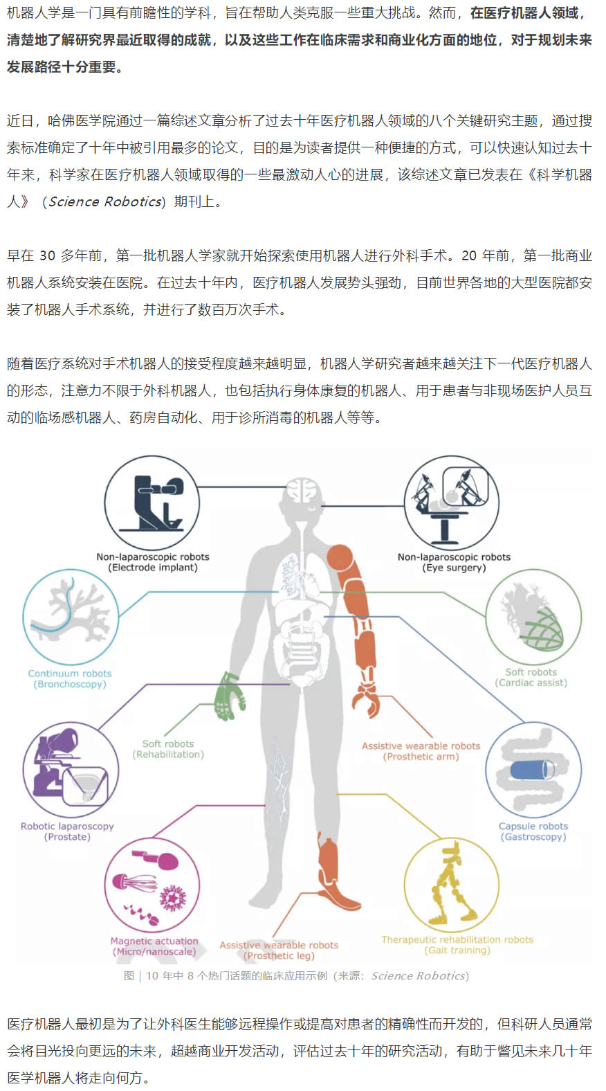 研究人員通過搜索 2010-2020 年期間《科學(xué)》雜志上被引用多的醫(yī)療機(jī)器人論文,確定了八個熱門研究主題,包括機(jī)器人腹腔鏡、用于微創(chuàng)手術(shù)的非腹腔鏡機(jī)器人、輔助穿戴式機(jī)器人、治療康復(fù)機(jī)器人、膠囊機(jī)器人、磁驅(qū)動、軟體機(jī)器人和連續(xù)體機(jī)器人等。