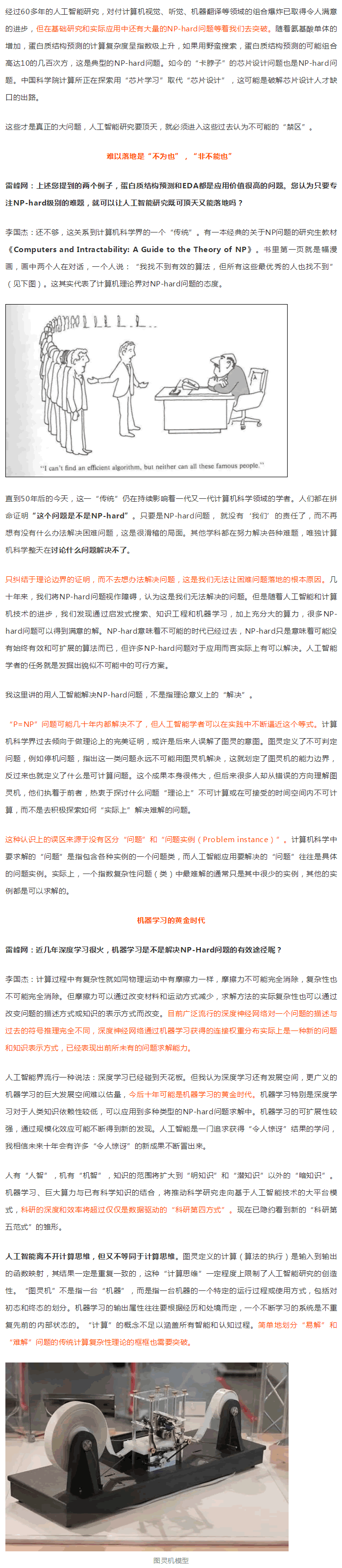 “像人”的人工智能是一個已經(jīng)被大家很重視的方向,但我認(rèn)為人工智能的另一個發(fā)力點是「解決大問題」。尤其是用機器學(xué)習(xí)的方法解決意義重大的科學(xué)難題,即在多項式時間內(nèi)“有效解決”指數(shù)復(fù)雜性問題。