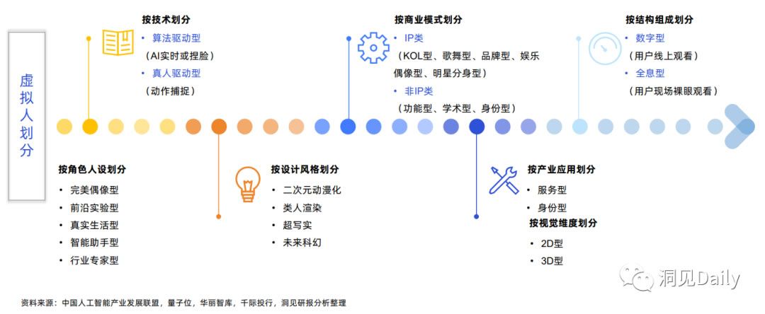 人工智能、虛擬現(xiàn)實(shí)等新一代信息技術(shù)手段的革新,J大地豐富了虛擬人的用途與種類。按照不同的劃分標(biāo)準(zhǔn),虛擬人的類型不一,本報(bào)告列舉了七種不同的分類情況。