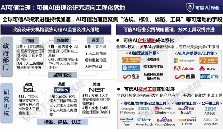 可信AI由理論研究邁向工程化落地。隨著人工智能技術的快速發(fā)展,社會各界對可信AI研究已經從理論探索逐步走向工程化落地實踐。政府與研究機構相關政策和規(guī)范從宏觀指導,開始向可操作、可落地的規(guī)范演進。在法律監(jiān)管層面,各政府部門的法規(guī)政策愈發(fā)重視實施和操作。例如新加坡于5月出臺世界AI治理測試框架及工具包;英國6月宣布人工智能倫理和監(jiān)管的重大研究計劃。