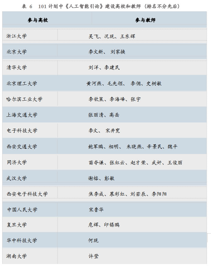 101 計(jì)劃啟動(dòng)以來(lái), 33 所計(jì)算機(jī)科學(xué)類基礎(chǔ)學(xué)科拔尖學(xué)生培養(yǎng)基地建設(shè)G校 中 15 所G校的 40 位老師參與了《人工智能引論》 課程建設(shè) (見(jiàn)表6) 。通過(guò)討 論, 參與建設(shè)教師認(rèn)為人工智能具有多學(xué)科交叉綜合、 滲透力和支撐性強(qiáng)、G度 復(fù)雜等特點(diǎn), 呈現(xiàn)技術(shù)屬性和社會(huì)屬性G度融合特色。