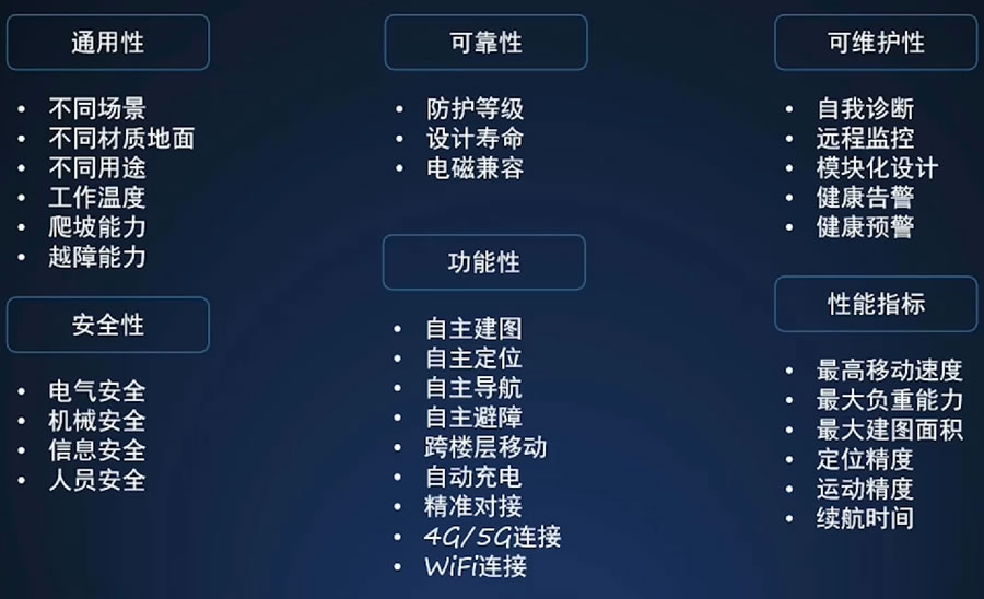 1 通用性:不同場景、不同材質(zhì)地面、不同用途、工作溫度、爬坡能力、越障能力。