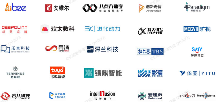 商湯科技,優(yōu)必選,科大訊飛,深蘭科技,影譜科技,依圖科技,曠視,云從科技,創(chuàng)新奇智,影創(chuàng)科技,進(jìn)化動力,百應(yīng),靈犀,數(shù)美科技,雙太數(shù)科,飛步科技
