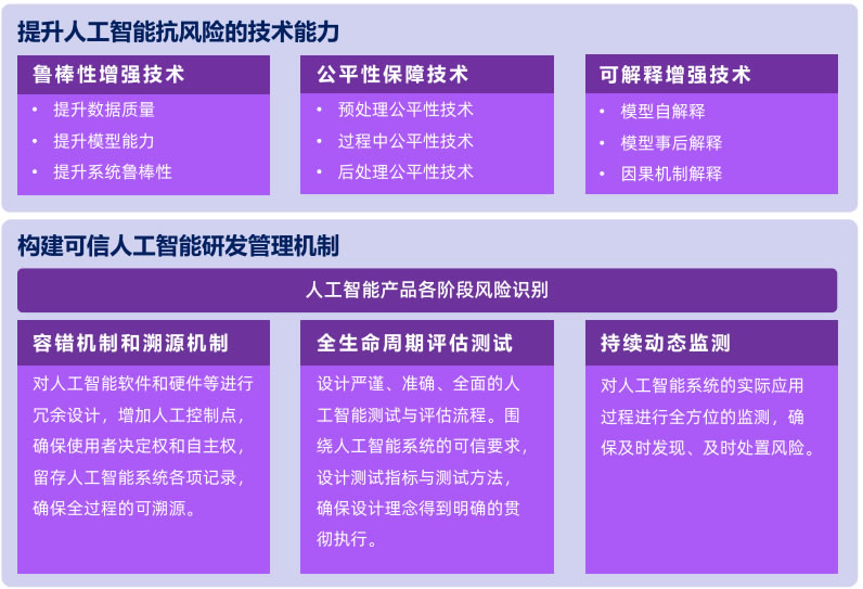 工智能仍是一項(xiàng)新技術(shù),回顧其發(fā)展歷程,真正大范圍地從實(shí)驗(yàn)室走向產(chǎn)業(yè)實(shí)踐、 廣泛應(yīng)用于我們的生產(chǎn)和生活之中,不過是十年的事情。持續(xù)探尋更健壯的技 術(shù)以及科學(xué)管控現(xiàn)有技術(shù)的"缺陷”,構(gòu)建面向可持續(xù)發(fā)展的人工智能技術(shù)體系, 致力于推動(dòng)人工智能技術(shù)可用、可靠、可信,其內(nèi)涵包括提升技術(shù)安全和構(gòu)建技術(shù)管理機(jī)制兩個(gè)層面工作。