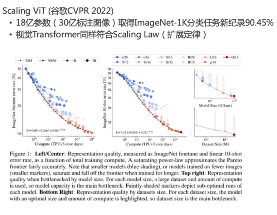 預(yù)訓(xùn)練大模型是過(guò)去幾年AI發(fā)展主旋律,但是主要集中于自然語(yǔ)言處理L域。視覺(jué)L域 在2021年開(kāi)始迎來(lái)進(jìn)展。谷歌構(gòu)建了一個(gè)擴(kuò)展的ViT模型,擁有18億參數(shù),并使用30億的 標(biāo)注圖像進(jìn)行訓(xùn)練,在ImageNet上取得了新的記錄(90.45%)。這一工作還表明,在視覺(jué)L 域上,模型同樣符合Scaling Lawo即:模型越大、性能越好。