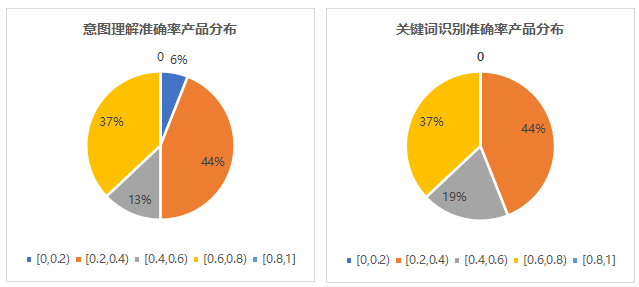 通過圖3中的性能指標(biāo)產(chǎn)品分布情況可知,多數(shù)參評(píng)產(chǎn)品意圖理解和關(guān)鍵詞識(shí)別準(zhǔn)確率分布在[0.2,0.4)和[0.6,0.8),反映出參評(píng)產(chǎn)品在性能上的兩級(jí)分化,建議相關(guān)企業(yè)及時(shí)豐富疫情相關(guān)語料并進(jìn)行產(chǎn)品優(yōu)化,提升問題解決率。