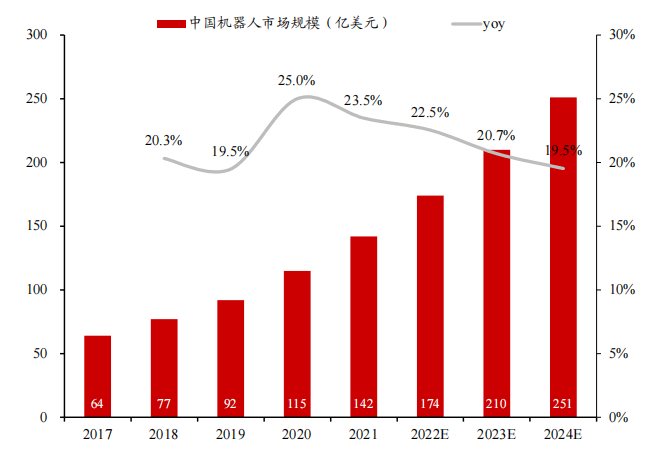 根據(jù)IFR、中國電子學(xué)會(huì)數(shù)據(jù),預(yù)計(jì)機(jī)器人市場規(guī)模2024年有望達(dá)到660億美元,2020-2024年CAGR約18%。