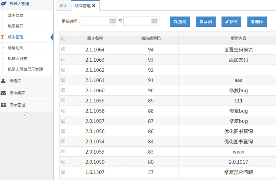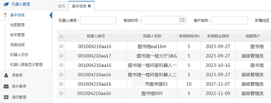 迎賓機(jī)器人管理的功能是對(duì)用戶使用的機(jī)器人信息進(jìn)行管理,包括機(jī)器人基本屬性的配置,以及相關(guān)信息的常規(guī)操作,增刪改查等功能。