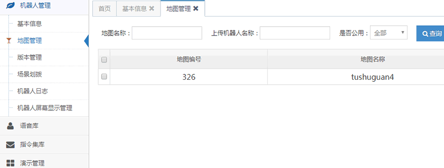 地圖管理模塊是對(duì)機(jī)器人地圖庫(kù)及對(duì)應(yīng)地圖和記錄點(diǎn)的查看,包括地圖名稱,對(duì)應(yīng)的機(jī)器人名稱和更新時(shí)間等內(nèi)容。